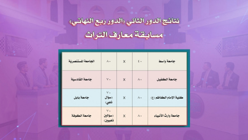 تأهلتْ إلى الدورِ الثاني (الدور ربع النهائيّ) من مسابقةِ معارفِ التُراثِ، ثمانيةُ فرقٍ بعد ان اجتازت الدورَ الأوّلَ منها (دور المجموعات) بتفوقٍ، وهذهِ الفرق هي (جامعة واسط، الجامعة المستنصرية، جامعة الكفيل، جامعة القادسيّة، كلية الإمام الكاظم ع/ أقسام بابل، جامعة بابل، جامعة وارث الأنبياء ع، جامعة الكوفة). وخاضت هذهِ الفرقُ مبارياتٍ تنافسيّةً شديدةً خلالَ هذا الدورِ (الدور ربع النهائيّ)؛ إذ تمّ حسم بعض المباريات بالسؤالِ الذهبيّ بعد تعادل الفريقين بالأسئلةِ الرئيسيّةِ، وممّا يُميّز هذا الدور عن الّذي سبقه، هو حذف وسيلة المساعدة (الاستعانة بالجمهور)، وإبقاء وسيلتين هما (حذف إجابة، الاتصال بقناة المعارف). وكانت نتائج هذا الدور، كما يلي: جامعة واسط 40 * الجامعة المستنصريّة 80 جامعة الكفيل 80 * جامعة القادسيّة 70 كلية الإمام الكاظم ع 80 * جامعة بابل 70 (بالسؤال الذهبيّ) جامعة وارث الأنبياء 80 * جامعة الكوفة 70 (سؤالين ذهبيين) وبالتالي فأنّ الفرق المتأهلة إلى الدور نصف النهائيّ، هي: (الجامعة المستنصريّة، جامعة الكفيل، كلية الإمام الكاظم ع/ أقسام بابل، جامعة وارث الأنبياء)، وفي هذا الدورِ أيضًا تم حذف وسيلة مساعدة أخرى وهي (حذف إجابة)؛ لزيادة قوة المنافسة بين الفرق المتباريّة، مع بقاء خاصية التحدي فعّالة إلى الدور النهائيّ.